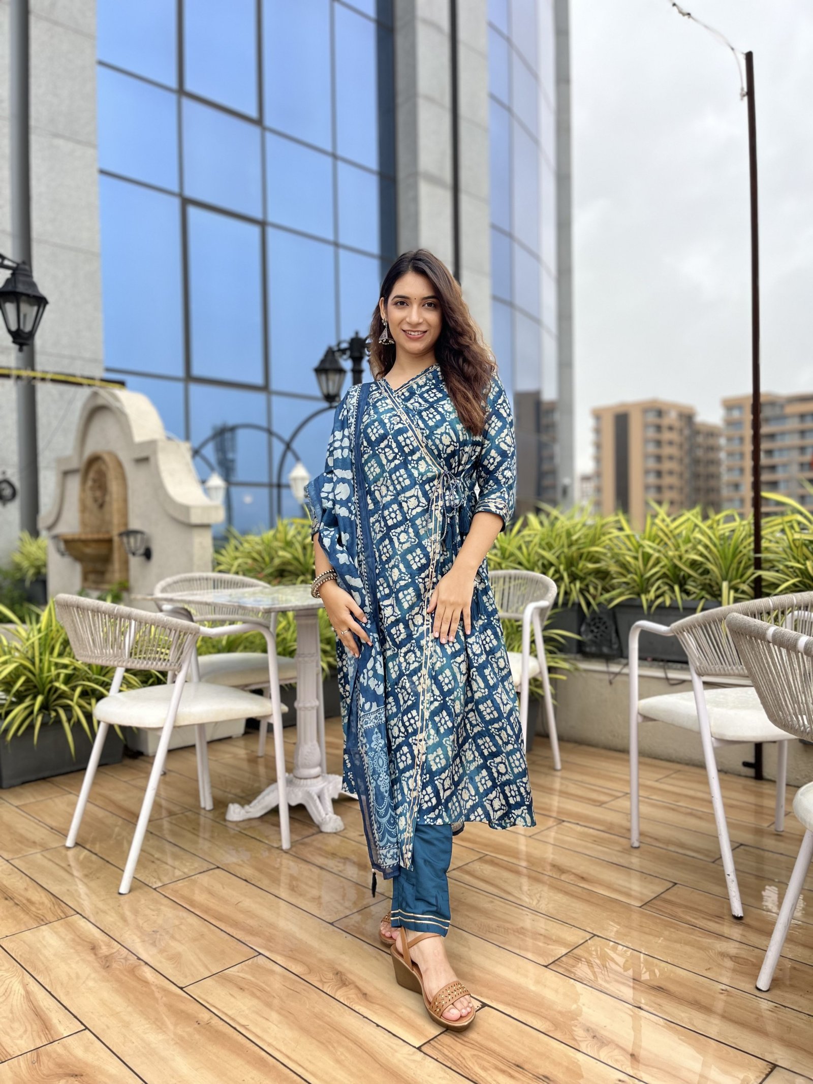 Shop now and redefine elegance with this Indigo Blue Kurta Set with Dupatta, crafted from luxurious Modal Silk. This fully stitched set features a functional overlap Angarkha kurti with intricate gota lace detailing on both the kurti and pants. Paired with a digital Chanderi dupatta adorned with tassels, this ensemble is perfect for festive occasions, casual gatherings, or celebrations.