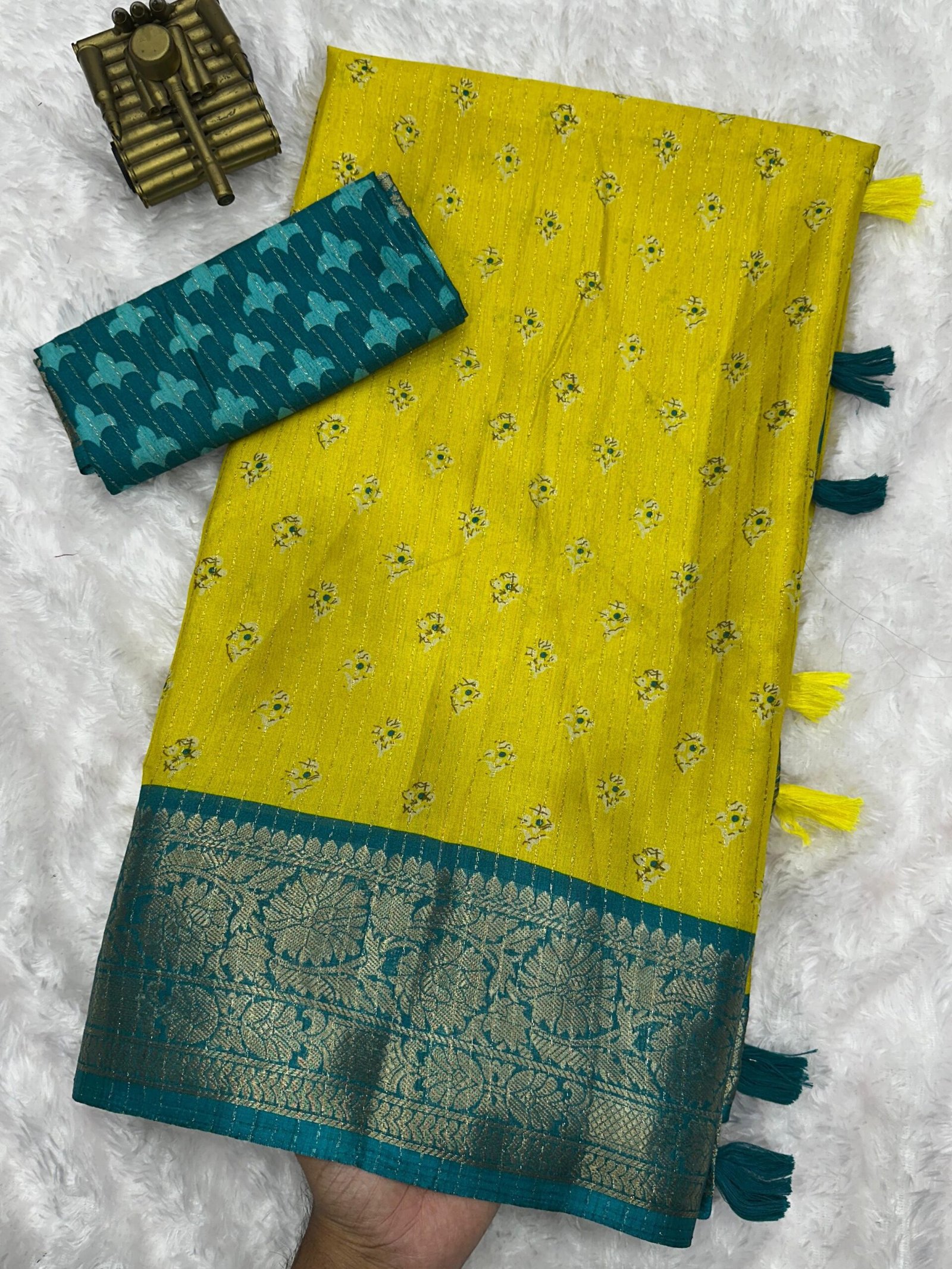 Discover the ideal combination of tradition and sophistication with our unique collection of muslin cotton printed sarees. This saree, designed for effortless elegance, showcases a lively contrast color border, intricate zari jacquard details, and a zari lining throughout, enhancing its sophistication. The pallu, embellished with tassels, adds to its allure, rendering it a beautiful option for festive occasions, casual meet-ups, and daily sophistication.